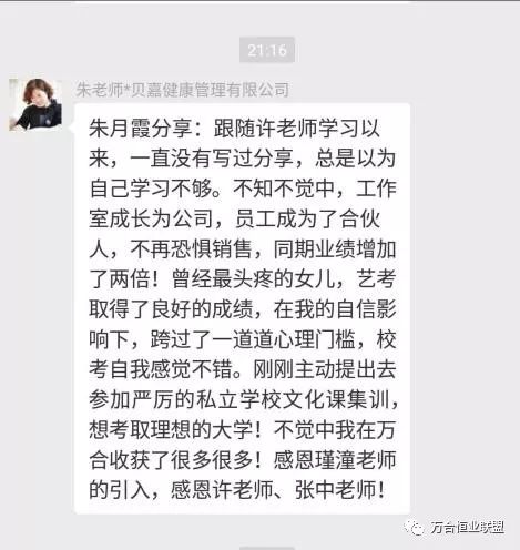 跟随许老师学习以来,不知不觉中,工作室成长为公司,员工成为了合伙人,不再恐惧销售。同期业绩增加了两倍。曾经让我最头疼的女儿,在我的自信影响下,跨过了一道道心理门槛,这次艺考也取得了良好的成绩。不知不觉中在万合收获了很多很多,感恩许罗轩老师,张中老师!