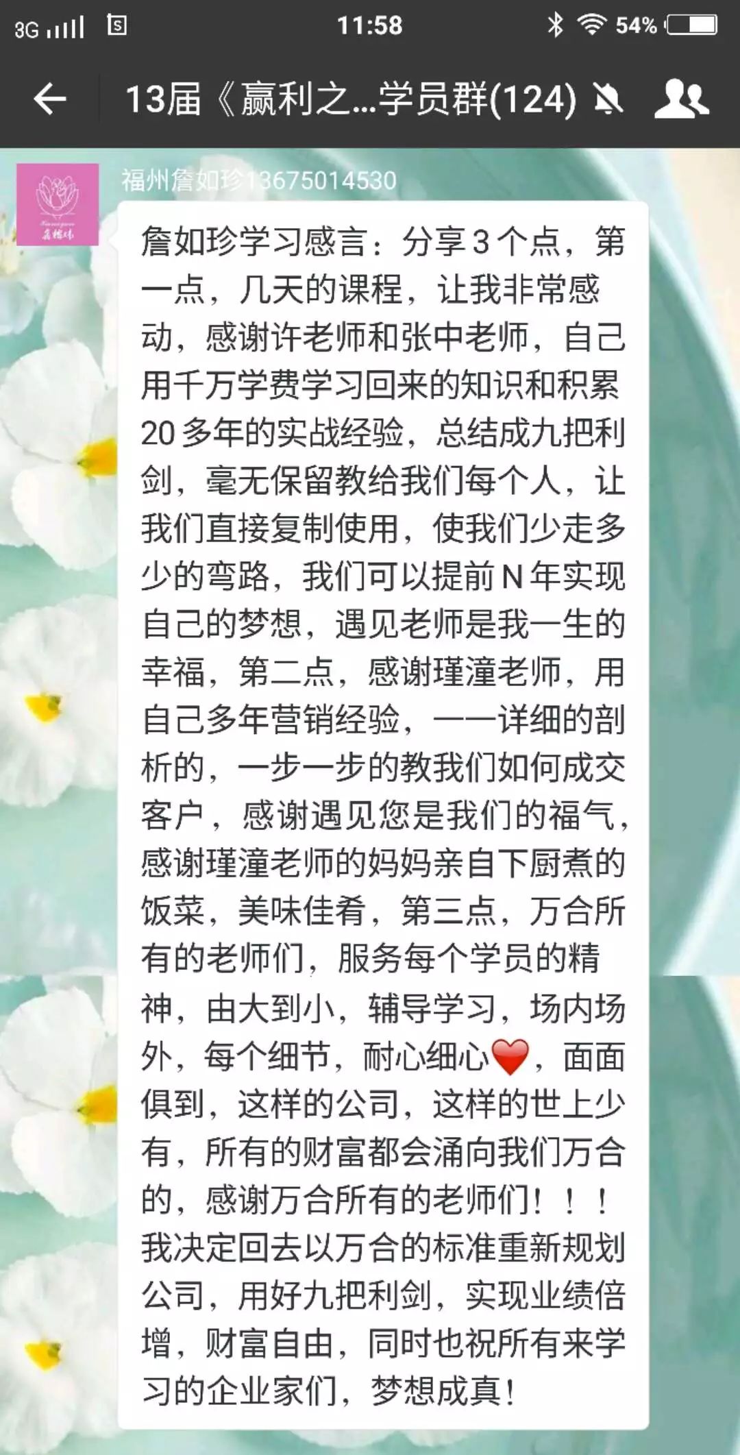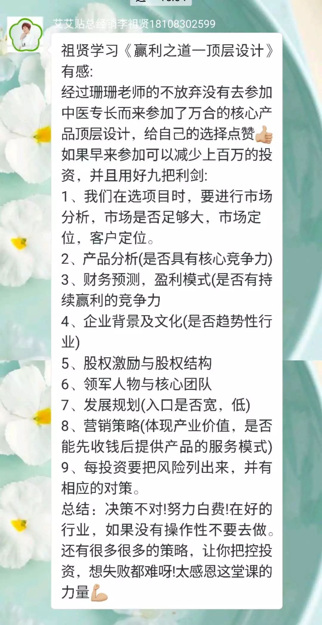 我用我宝贵的十五年编织一个美丽而沉重的企业壳,背在背上像乌龟一样爬,从来没有企业顶层设计和团队建设。在许老师和张中老师一对一指导下,我突然痛恨我以往的固执和坚持,让我明白:我与倒下的企业老板一样的智商。公司成立两年多投资两百多万一点效益没有,还要往里砸钱。我很痛苦,我知道不能这样下去,我要学习,我庆幸选择了和许老师张老师学习!通过学习顶层设计,销讲,回家马上落地实践,这一个多月招商就实现了两百多万的收益!感谢老师!