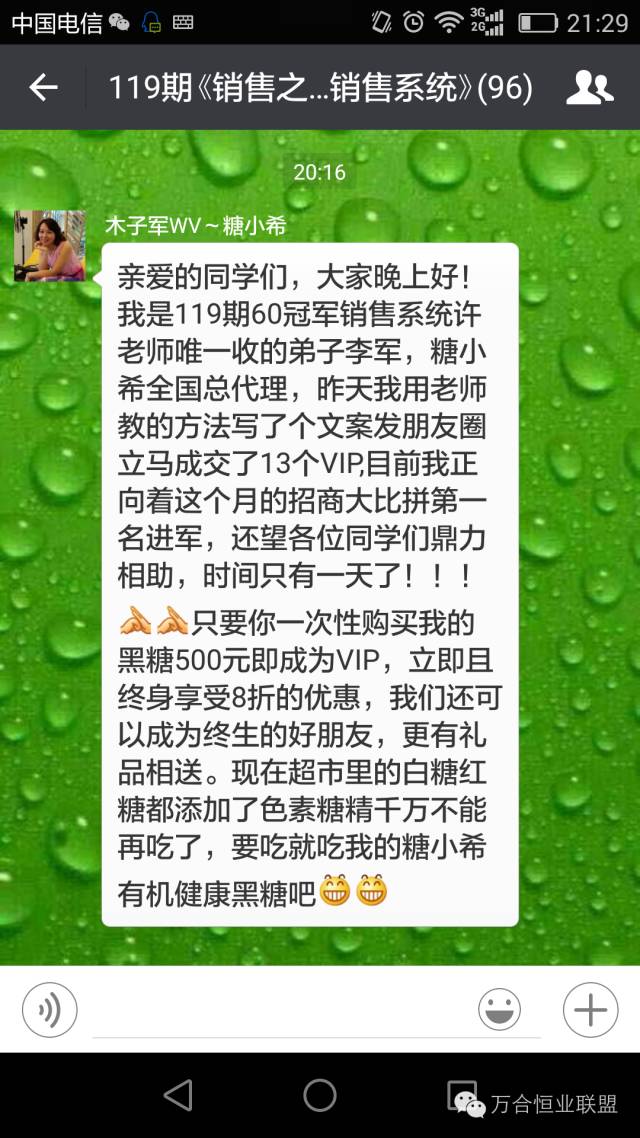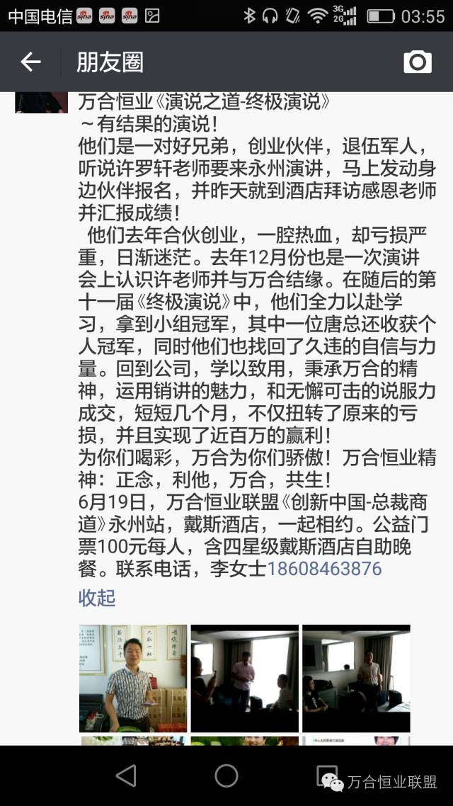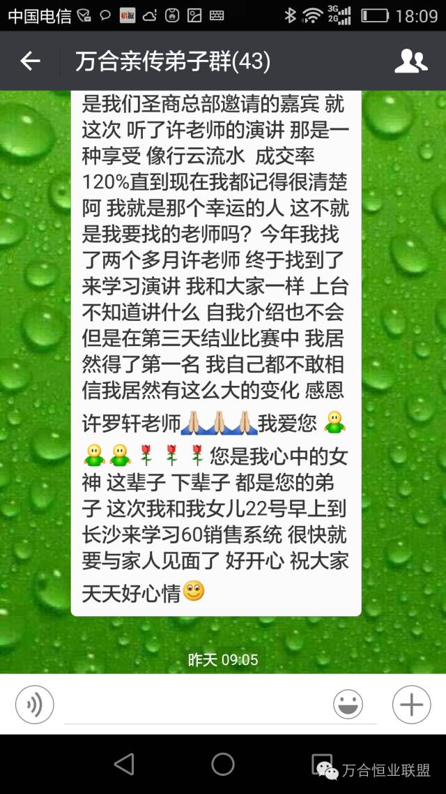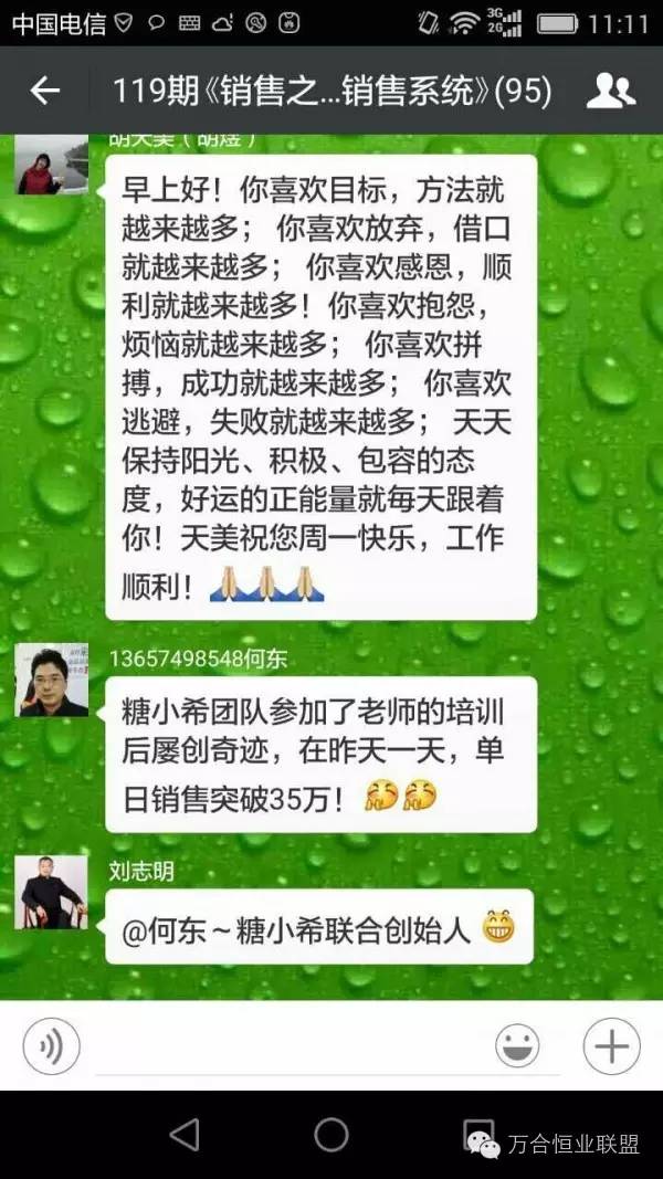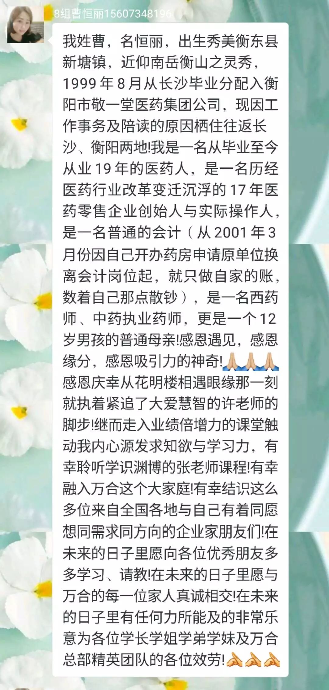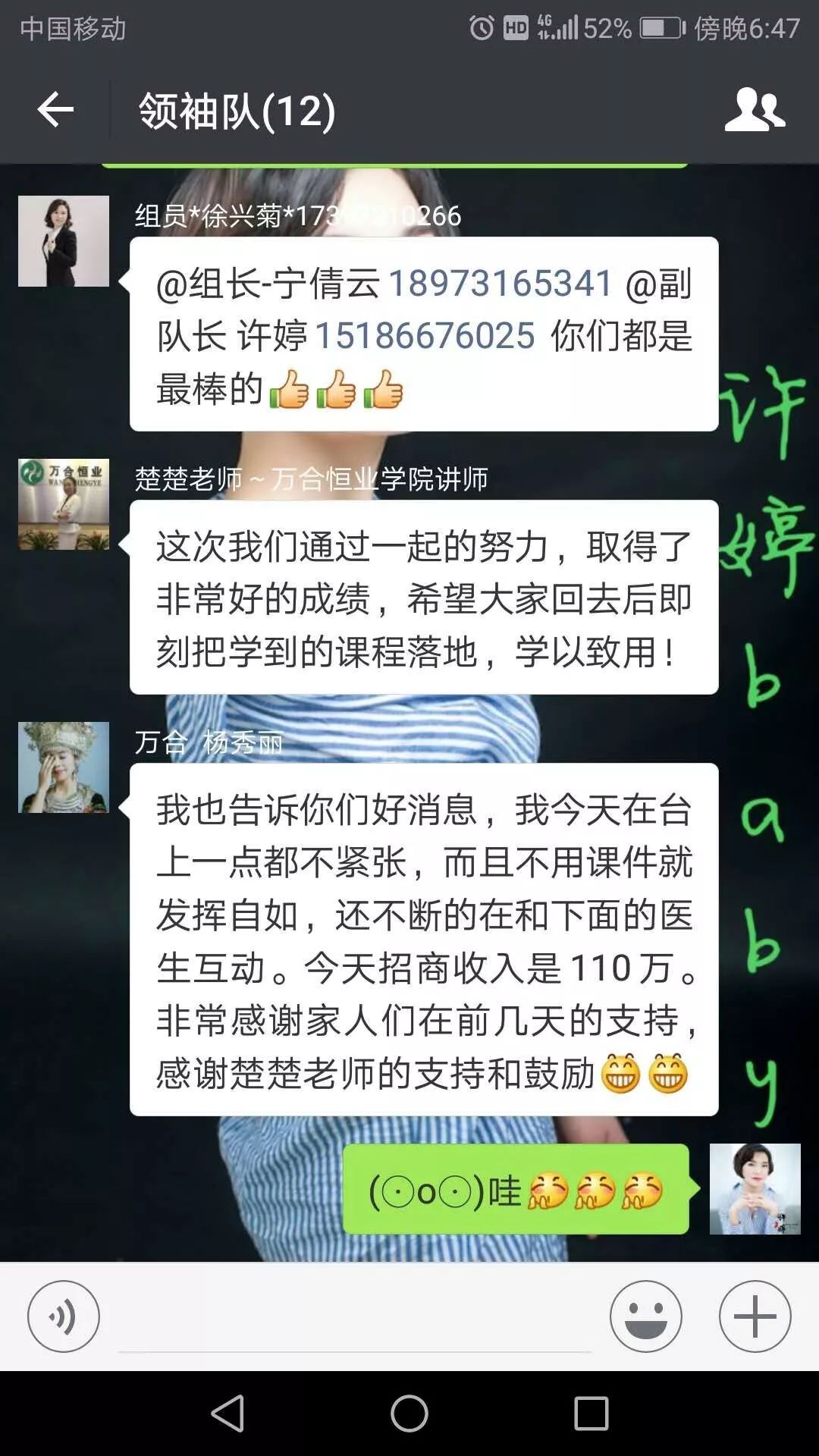 通过在万合恒业的学习,我在广西举办了首届母婴健康职业财富密码峰会,获得圆满成功。原来举办会议销售不理想甚至从来没有销售。在这次会议上,销讲获得巨大成功,现场两百人就成交了 100 多人,销售收款七八十万。感恩万合恒业,感恩许罗轩老师!