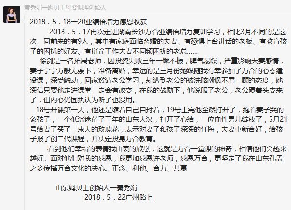 我是秦秀娟,是山东姆贝士的创始人。自从走入万合课堂我的变化巨大,身边的朋友都深有感触。所以在 138 期我复训的时候,有 9 位身边的朋友都来万合学习,其中有家庭面临离婚的夫妻、有恐惧上台讲话的老板、有教育孩子的困扰的好友、有拼命工作夫妻不同频困扰的老总......在此分享一个朋友的改变:他因投资失败,三年来一蹶不振,脾气暴躁,严重影响了夫妻感情,婚姻面临破碎的道路,幸运的是在他夫人的再三恳求下勉强来学习了。经过学习走出了失败的阴影,更是对妻子表示深深的悔恨和感恩,还送了一束玫瑰花给妻子,夫妻重修就好。面对他们对我的感恩,我更加坚定了我在山东孔孟之乡传播万合文化的决心。