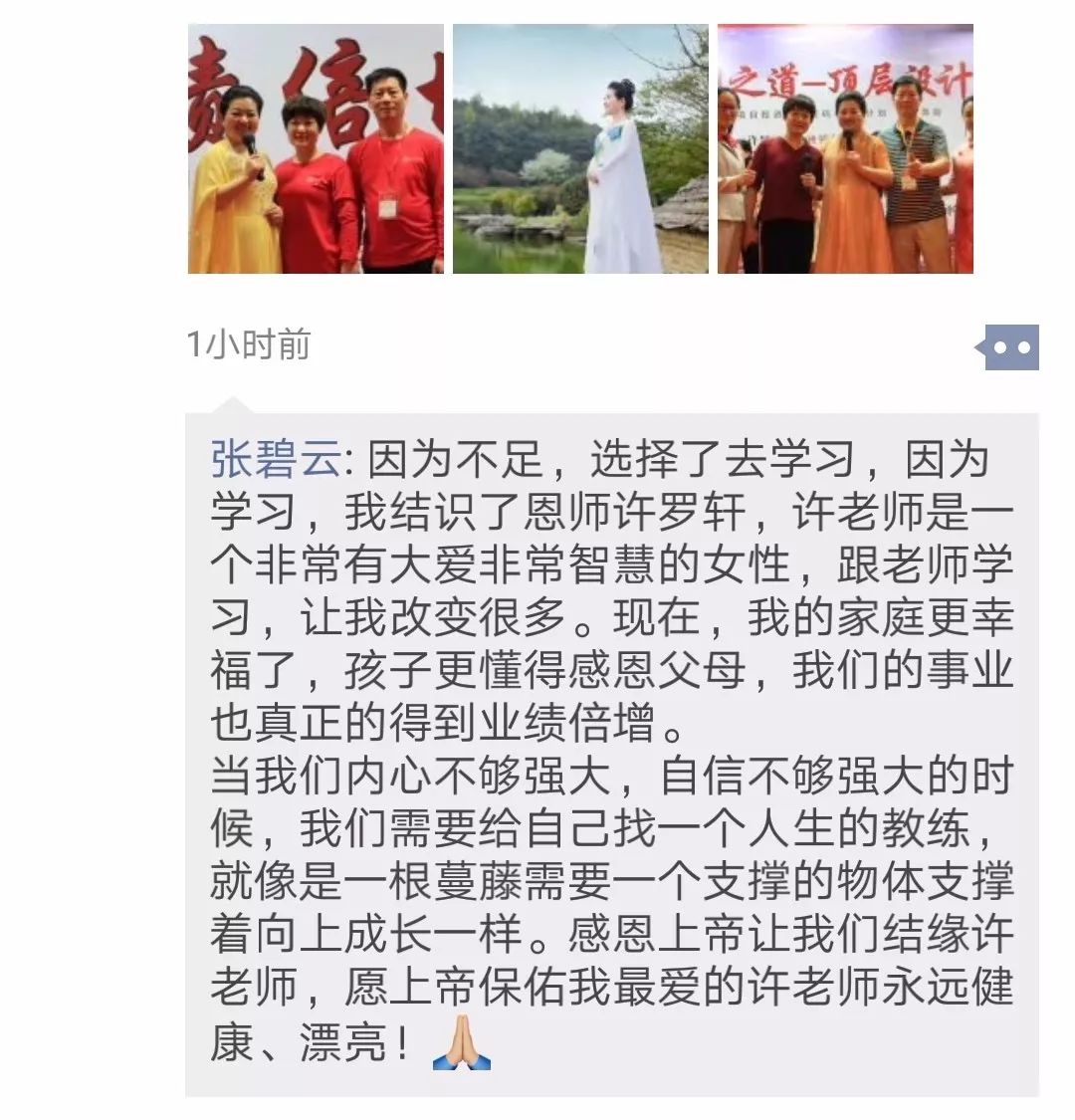 亲爱的许老师,因为有您,我对事业不再迷茫,对孩子教育也不再彷徨。您的出现,点亮了我的心灯,重燃了我的激情和梦想。通过万合恒业的系统训练,从打造团队、创二代的培养到生命的觉醒,一步一步助推我家庭事业平衡式发展。