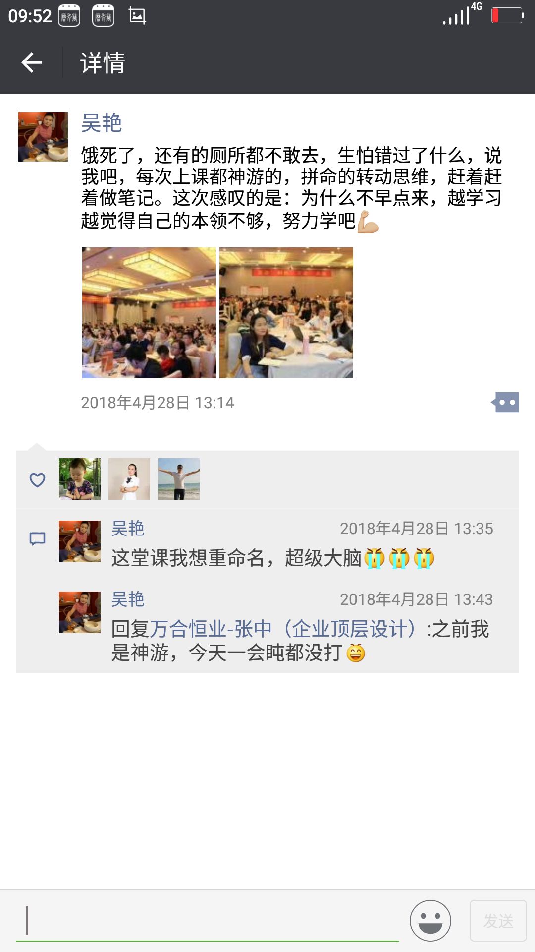 在这期间,我和张中老师偶然的一次微信互动,让我获得了一次和许罗轩老师以及张中老师单独请教的机会。一个多小时的辅导,让我一下子就有了自己非常清晰的方向。并随后走进了第122期业绩倍增力课程。短短三天两晚,亲眼见证了老师打造团队的厉害,满满的正能量,最关键的是因为许老师经营过21年的企业,带过团队,非常了解企业家老板的需求和痛苦,课程内容实战落地。