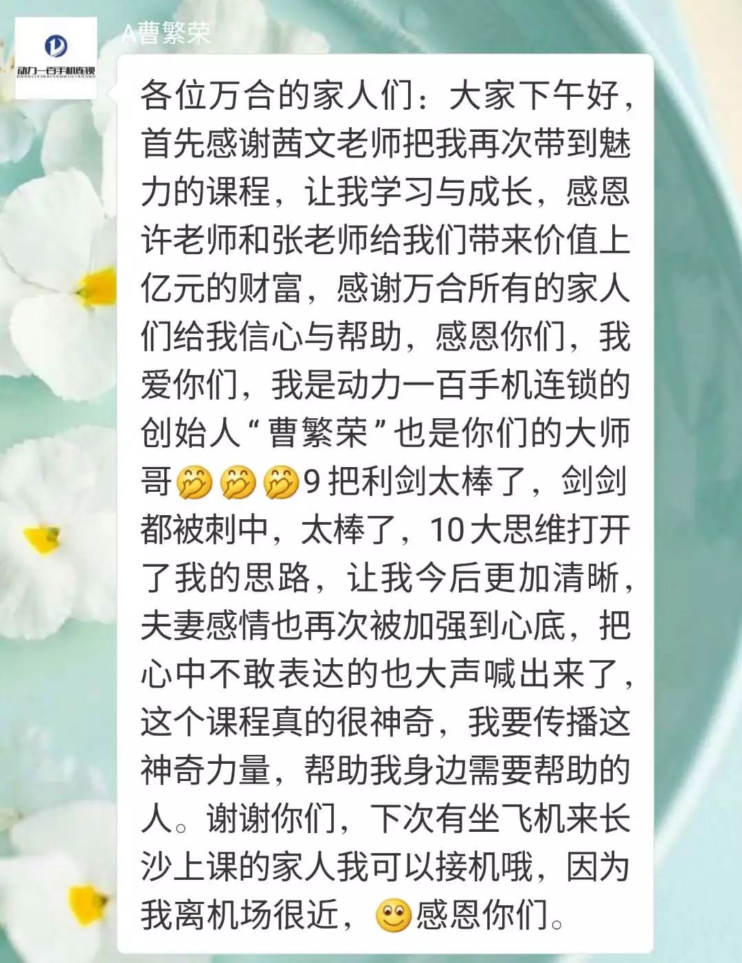我是宇飞来手机湖南地区负责人。通过跟随老师学习第一堂课【业绩倍增力】,我第一次的招商成交率从过去10%都没有一下子就达到了90%。老师的课程太神奇了,我于是坚定信心带领团队一起学习,通过一个月的系统学习,湖南地区的手机销售量由过去的500台,一下子倍增到3000台,倍增了6倍,省市地区销量排名从全国20几名一下子就提升到全国第8位。老师的课程真正是实战落地,帮助了我们,实在太有效了!感谢万合恒业,感谢恩师许老师,让我事业再上一层楼!