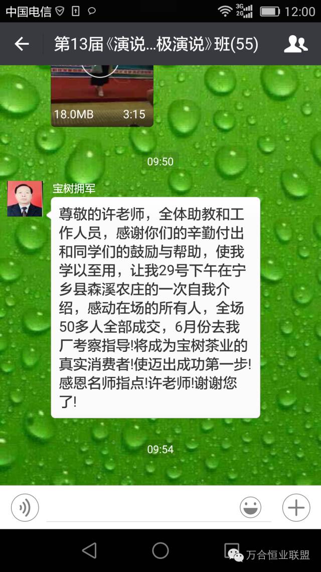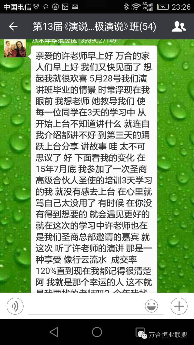 重要的是我在许老师与张中老师的课程里学习后的改变也影响到我的老公,让我的老公从此也爱上了学习,他也报名了导师班,我们夫妻共修,感情越来越好,家庭关系越来越和谐,公司的事业发展也越来越顺利。我们的学习成长也成为了孩子学习的榜样,主动跟我讲要学习许老师的演讲课,通过学习创二代领袖课程,从以前一个调皮捣蛋、不爱学习、不懂感恩到现在成为了一个爱学习、懂感恩、有礼貌的孩子,学习成绩从原来的中下成绩到现在的前十名,他的演讲吸引了所有的同学推荐他成为了六年一期的班长。今年我们企业被评为了湖南省20家优秀家政企业之一。非常感谢许老师,感谢万合恒业。我决定从此做老师爱的种子,传播到世界的每一个角落,生根发芽。